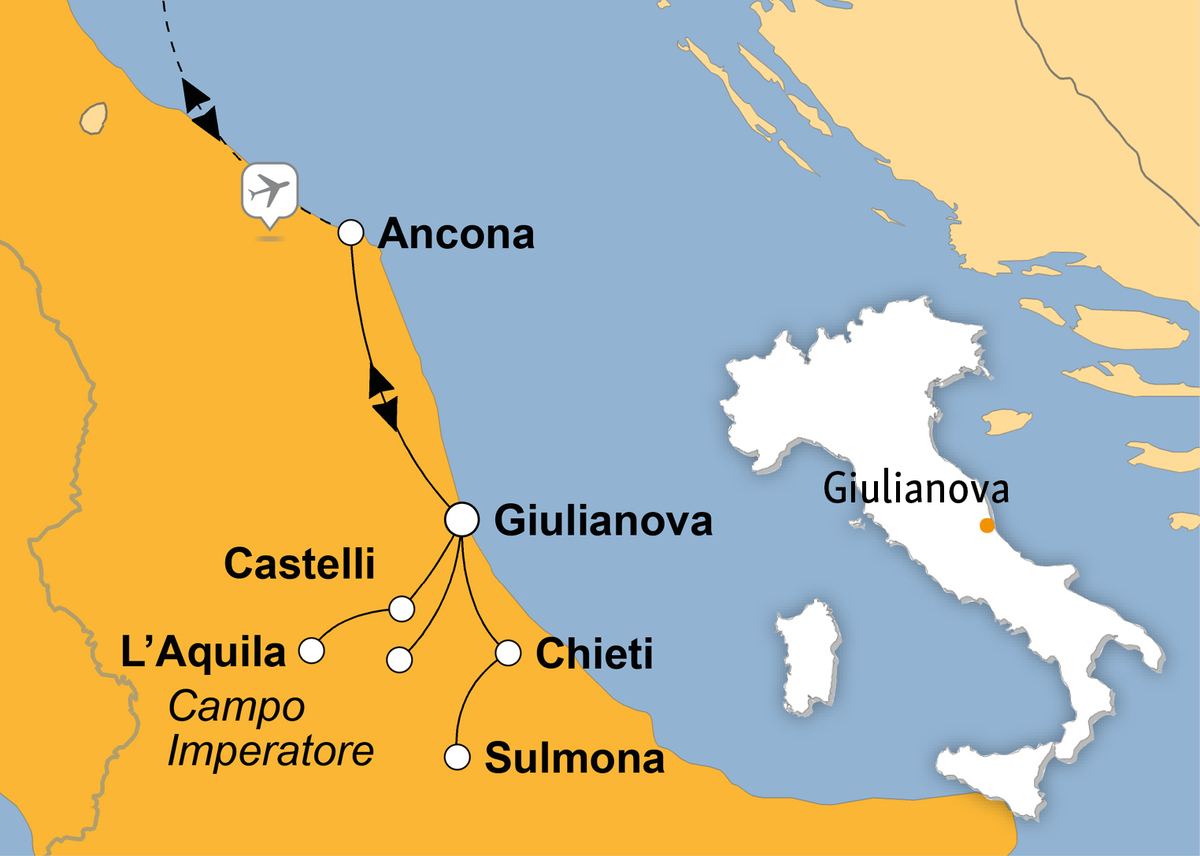 Giulianova, das charmante Küstenstädtchen, bildet den perfekten Ausgangspunkt direkt am Meer. Im Hinterland erwarten Sie kulturelle Schätze wie Sulmona mit der Kathedrale San Panfilo und dem mittelalterlichen Aquädukt, die Klöster Abbazia di S. Clemente a Casauria, Chieti mit antikem Theater und Porta Napoli sowie die malerischen Dörfer von Castelli, wo die traditionsreiche Keramikkunst der Abruzzen lebendig wird.