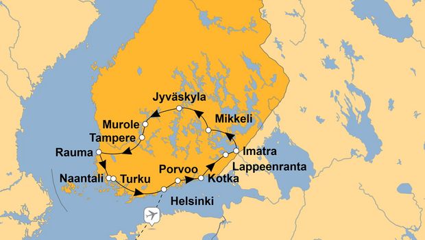 - Ausflüge: auf dem Königsweg mit Perna, Loviisa, Kotka und Hamina nach Südkarelien, von Lappeenranta mit dem Saimaakanal über Imatra zum Haukkavuori-Berg, durch die Seenplatte nach Murole, entlang der Westküste mit Naantali nach Turku, über Mathildedal und Fiskars nach Helsinki