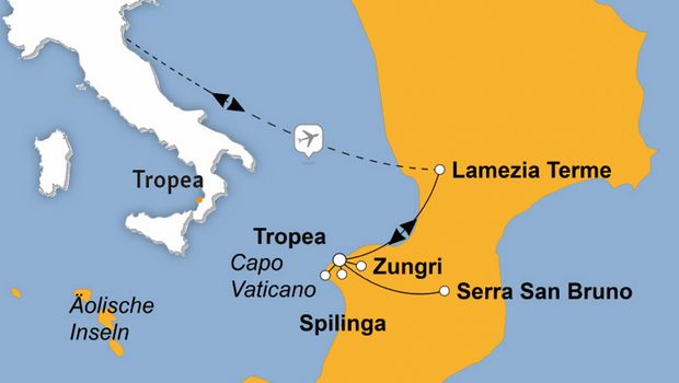 Die Reise nach Kalabrien beginnt mit dem Flug von Deutschland in die süditalienische Region. Gemeinsam mit der Reiseleitung fahren Sie in Ihr Vier-Sterne-Hotel.